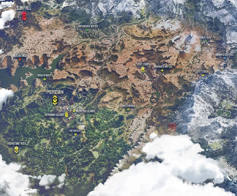 ₯ Корона Матері ₯ Зібрання Мисливців ₯ Табір Банук ₯ Денна вежа ₯ Світанкова Вахта ₯ Ранкова Вахта ₯ Самотнє світло ₯ Бездоганна вахта ₯ Арка Слави ₯ Королівський Меандер |