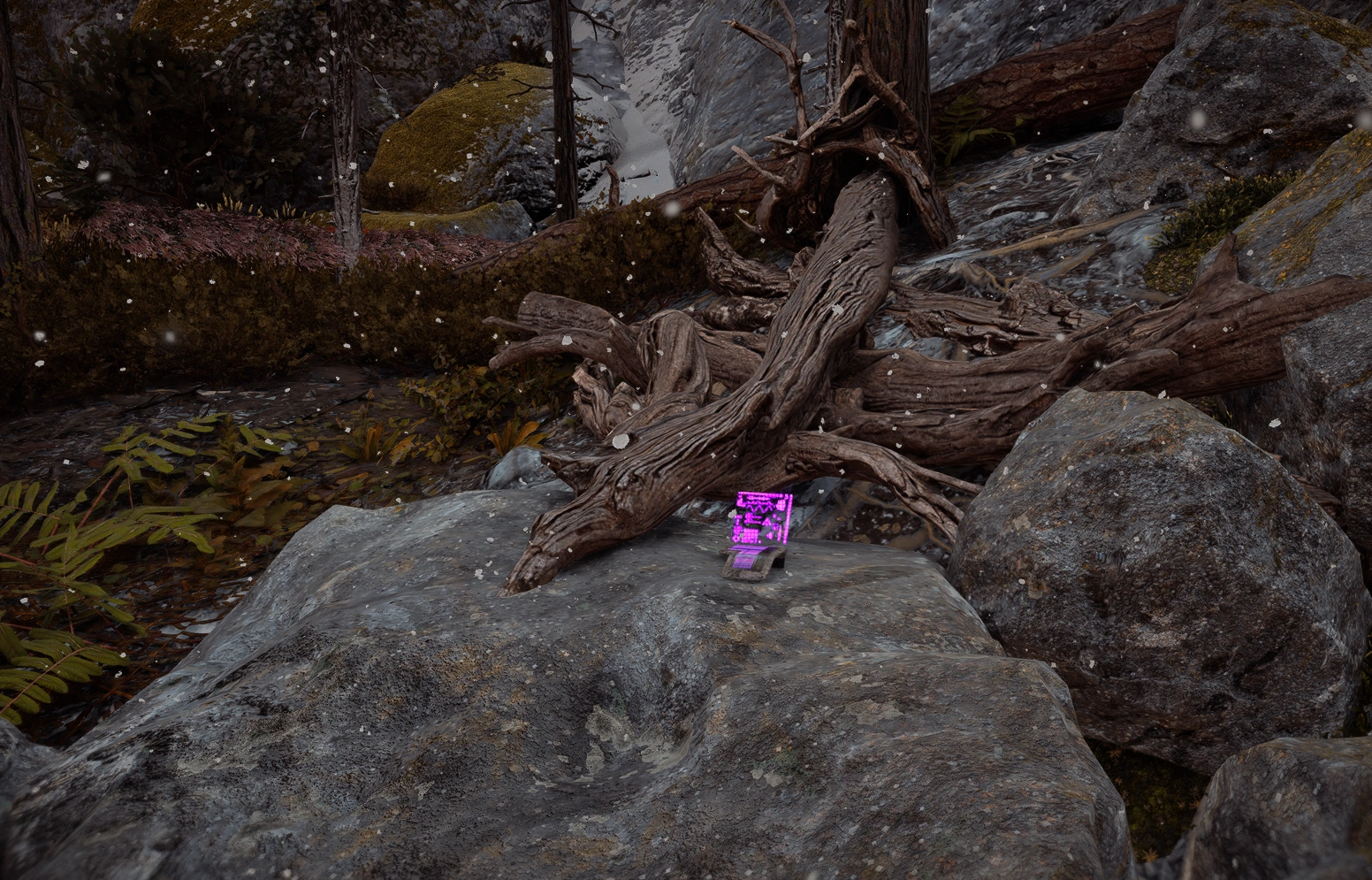 This datapoint is located at the base of a cliff beside a wooden bridge west of the campfire southwest of Stone Crest.