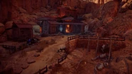 Brin, a Shaman exiled from the Banuk tribe, has taken to a small wooden house off of the Dryrun Canyon in the Sun-Steps region of the Sundom. The exterior contains a few dissected machines and a campfire.