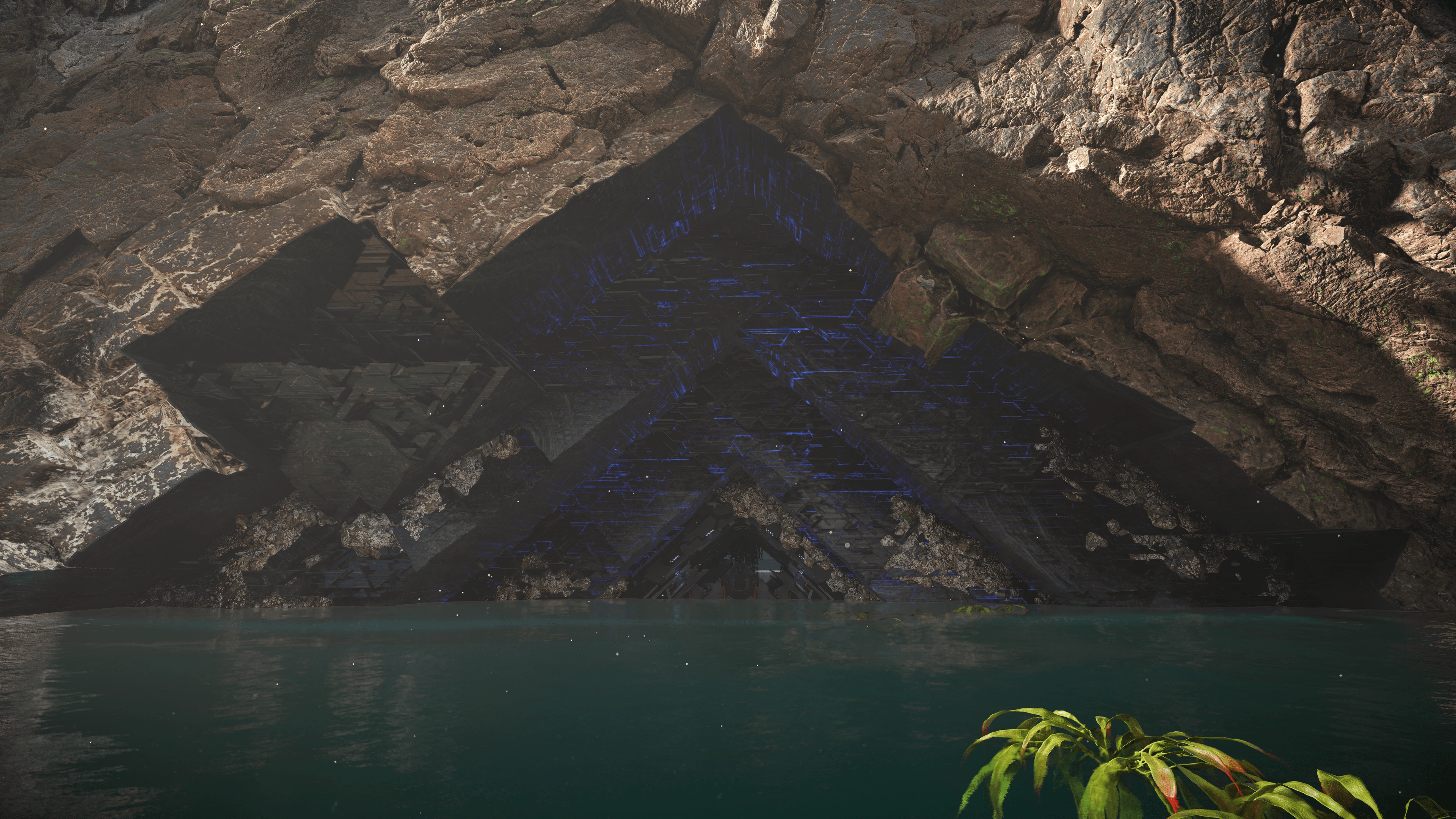 The entrances to Cauldrons mostly feature a triangular structure, sometimes guarded by a very bright energy barrier. The interior consists of dimly-lit hallways made up of thick cable-like material, and very large chambers with several elevated, dark-colored platforms, connected by a series of bridges that can only be crossed by overriding a nearby port, or in Cauldron RHO's case, a giant wheel mechanism. The interior is also littered with black and white pyramid-shaped supply crates and medicinal fungi. Entrances between different chambers also feature a triangular structure. Countless drones and magnetic rails carry resources between different parts of the Cauldron. Paths between different chambers sometimes open into natural caverns.