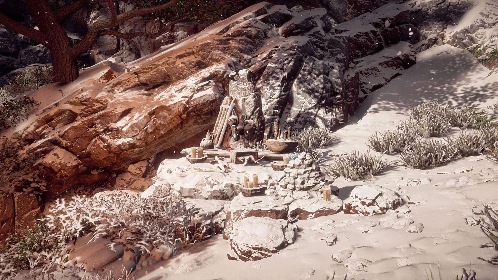 Additionally, while making her to way to the Shaman's Path, Aloy would've stumbled upon a crime scene with broken tents and frozen bodies. One of the bodies was that of a shaman and that they died from a cryo attack.[57] What would've happened from this point is unknown.
