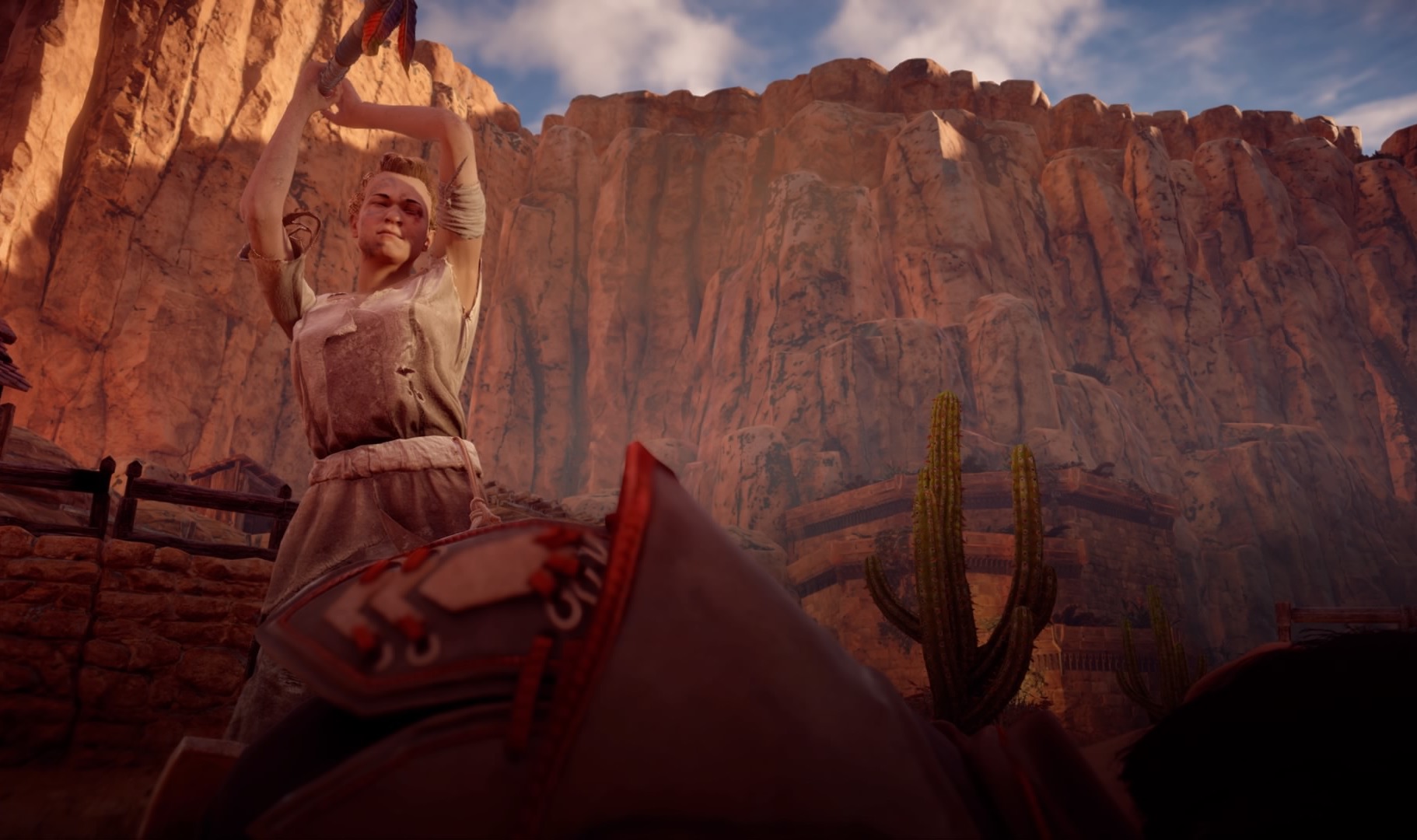 One cut scenario had Aratak already fighting the Frostclaws alone with several dead Banuk around him, in desperate need of help. Aloy's objective would've been to save him and fight off the machines, with Aratak wielding a weapon that synergizes with the player's ability.[59]
