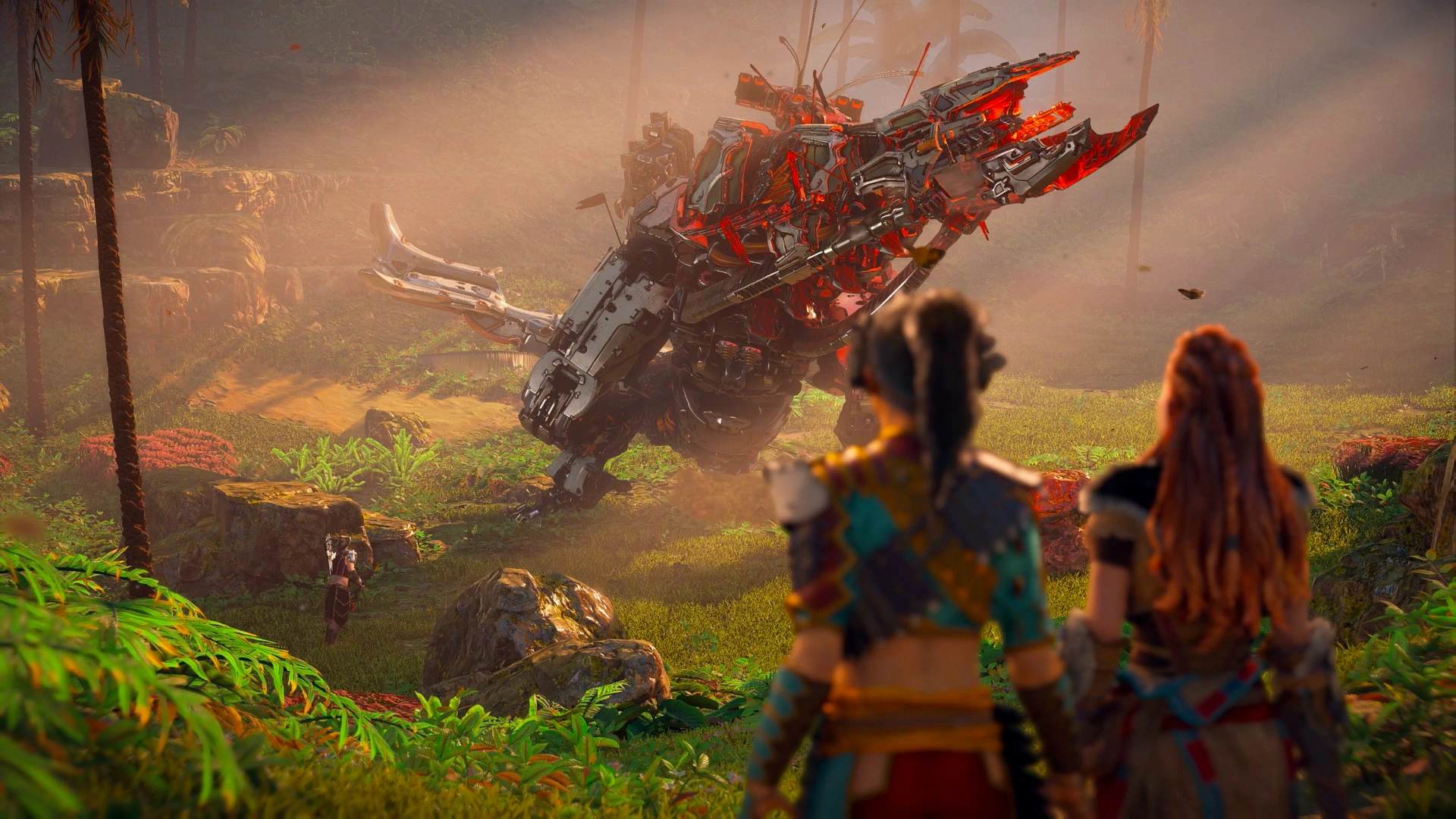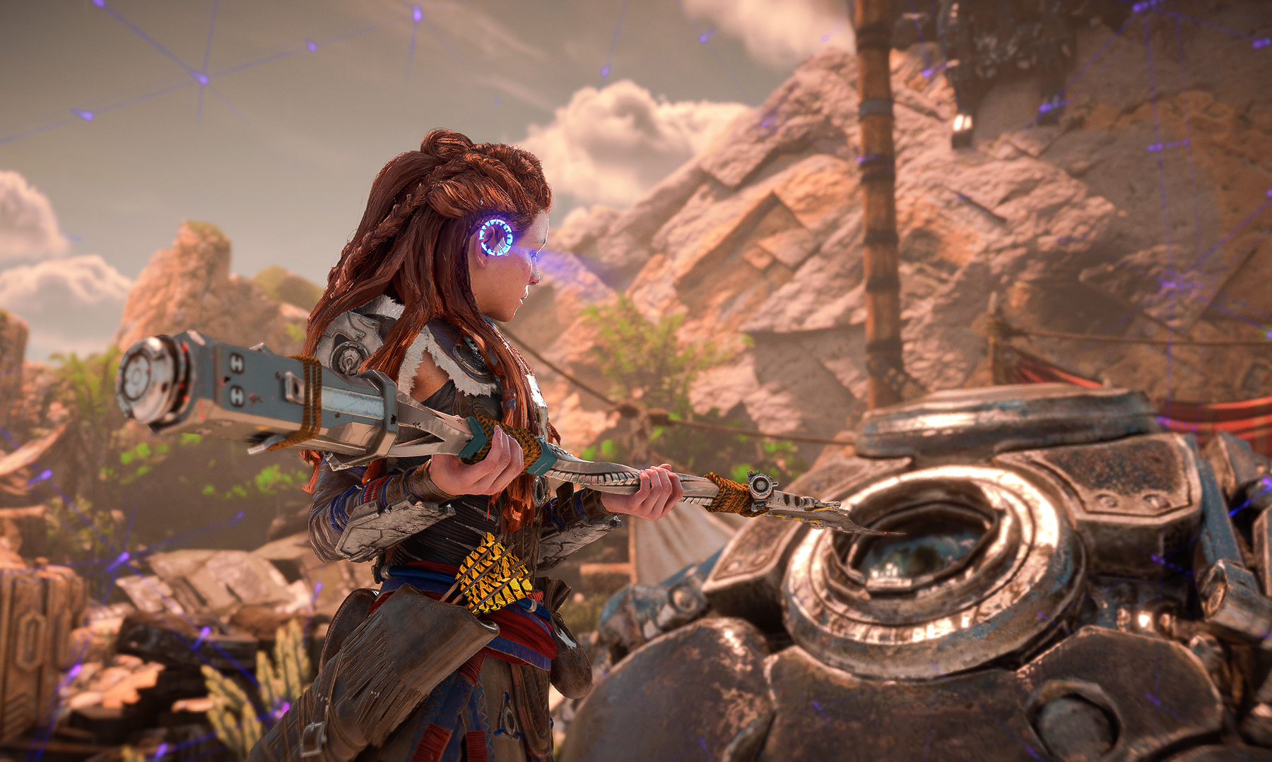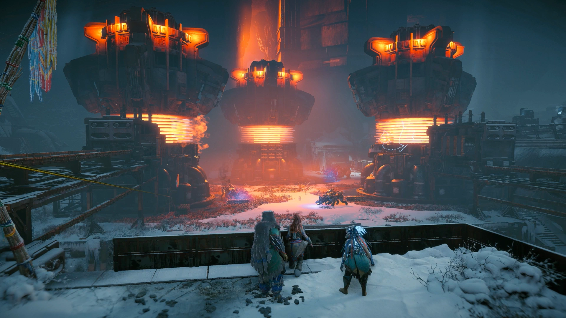 The other cut scenario had Aloy investigate strange sounds she heard on the trail. As she reached the final area, she would've found three Frostclaws are attacking observers. As Aloy readied herself to take them out, Aratak would zipline down and team up with her to take down the machines.[59]