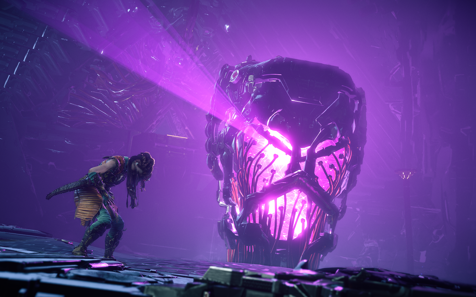 As revealed in the subtitle files for The Womb of the Mountain in the localization files of Horizon Zero Dawn Complete Edition, Aloy was supposed to be able to find a reliquary of High Matriarch headdresses going back centuries, arranged on the walls of All-Mother Mountain in the order of the women who wore them.[26] However, no such headdresses can be found in the final game.