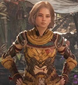Based on their outfits seen during gameplay, Eliza appears to be a Tenakth from the Desert Clan. Meanwhile, in the Announcement Video, a wide shot of various appearances that Eliza can have is shown, all wearing various outfits that appear to from the Nora, Carja, Oseram, Utaru and Desert Tenakth tribes. Notably, one appearance shown bares a strong resemblance to Thira.[1]