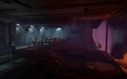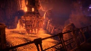 Firebreak is located on a vast plateau on Thunder’s Drum. The front of the facility is an enormous, imposing wall, now encased in ice, with vents and a door. The door opens to a power plant known as the Battery Facility. This power plant is still operational, presumably kept online by the artificial intelligence CYAN. Beyond the power plant is another large area, which leads to yet another large area with a huge geothermal energy tap. The far end of this area allows access to rooms and offices overlooking a huge cavernous chamber with rivers of magma flowing among large plateaus of solid rock.