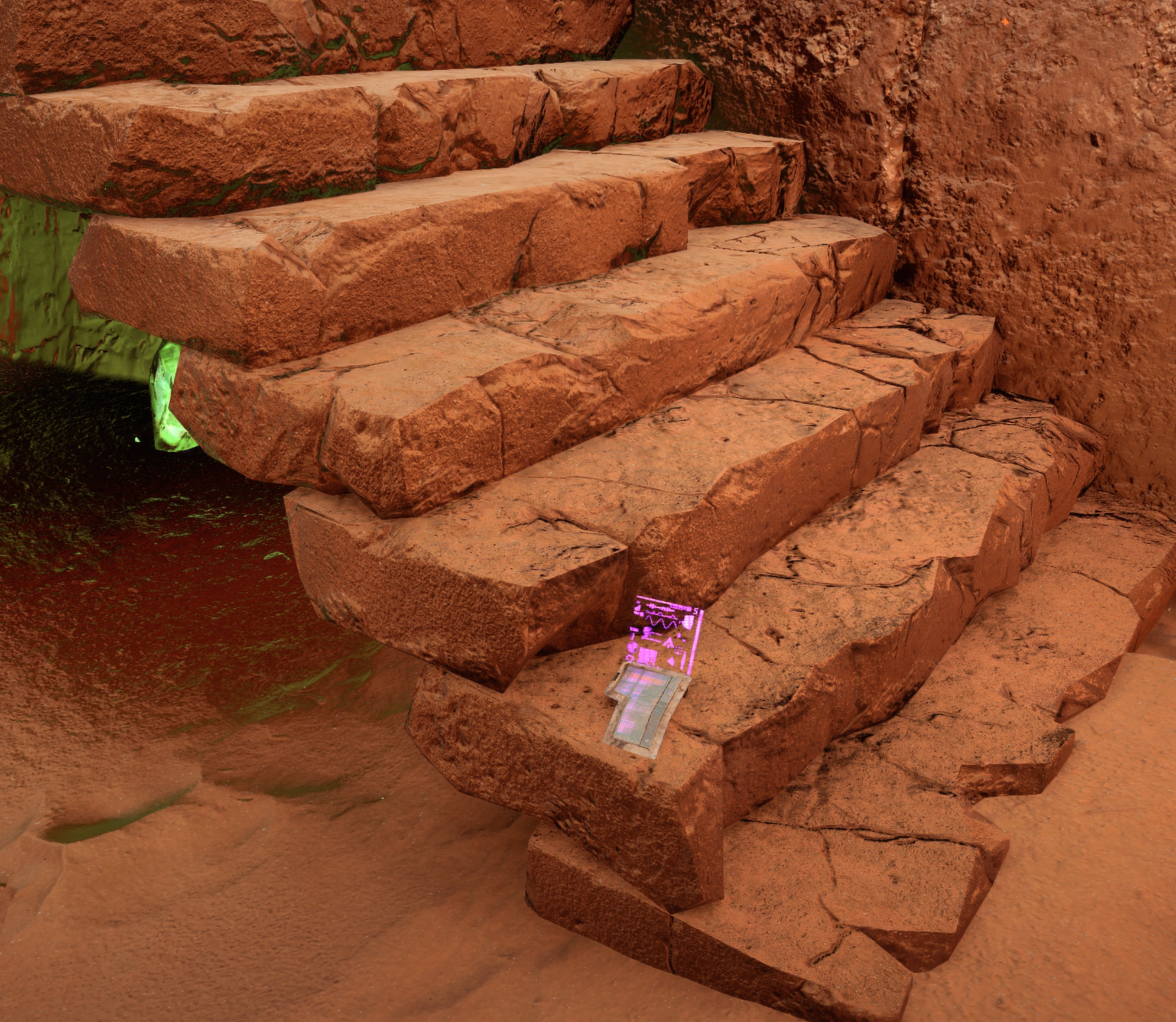 This datapoint is found on the stairs of a ruined building at the northeast edge of the Stillsands, just west of a Canister Burrower site.
