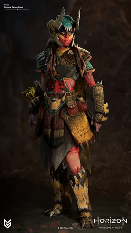 The Tenakth Vanquisher consists of a robe-like skirt made from multicolored Tenakth cloths and thin rope. Above this is a full-body breastplate, constructed from the same materials, and a strap around the shoulder made from machine parts. It also comes with bracers, made from machine parts dyed blue, as well as a headdress that resembles horns. While wearing the outfit, Aloy has Desert Tenakth tattoos on her body.